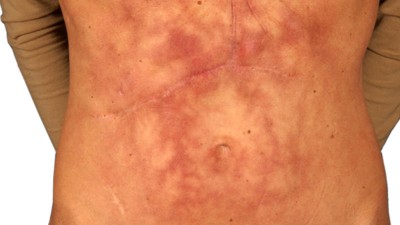 Es lagert sich in den Geweben vieler Organe an auch in der Haut. Bei vielen Patienten entstehen zusätzlich blau- grüne Flecken Ekchymosen im Bereich um den Bauchnabel herum. Die jucken nicht oder sonst was.