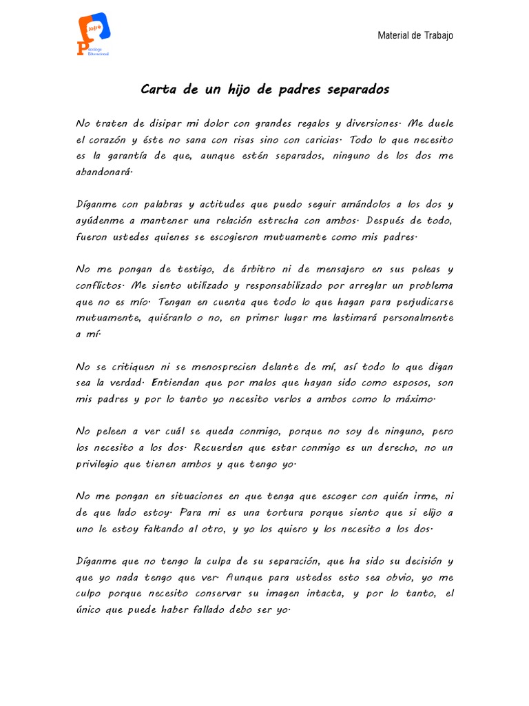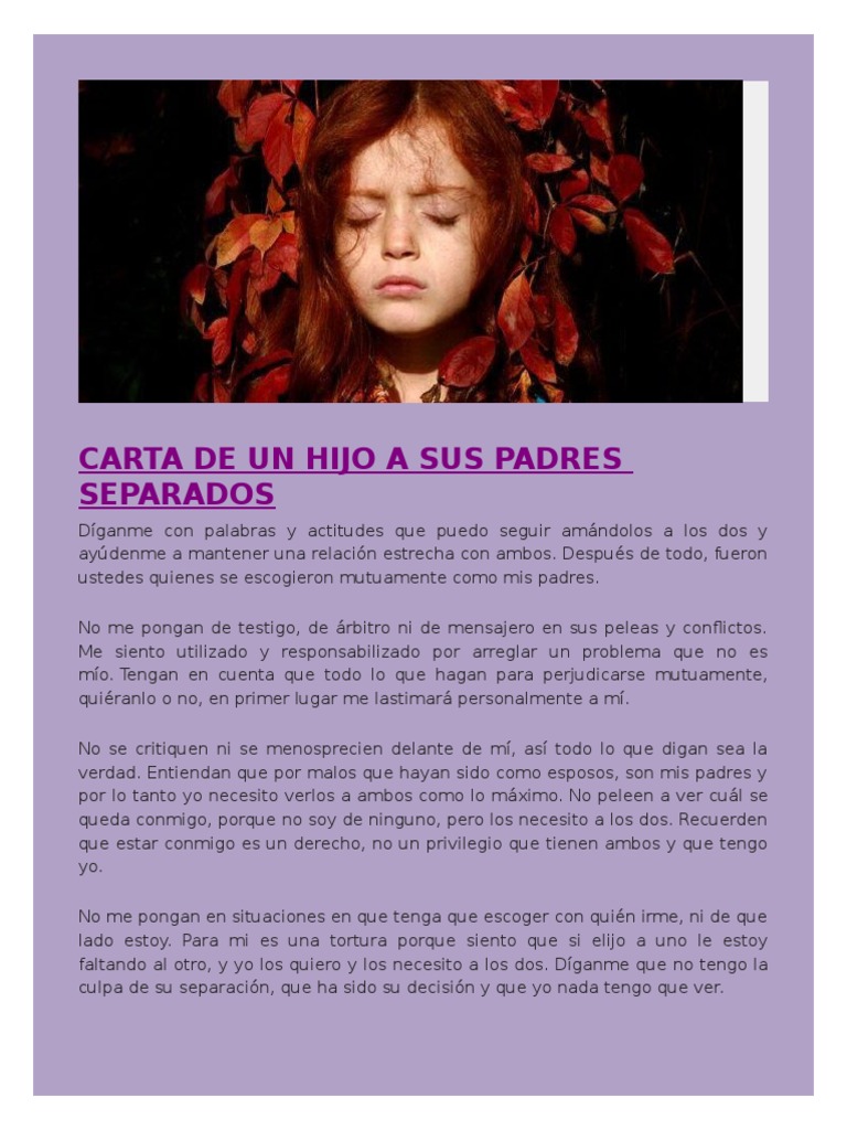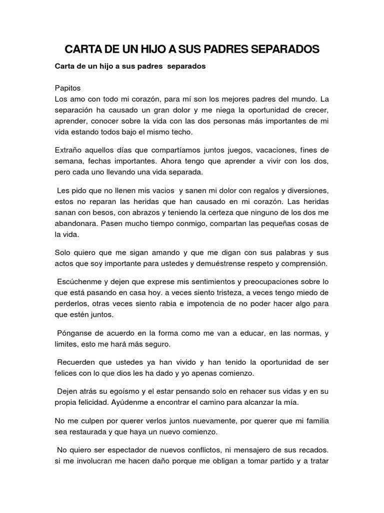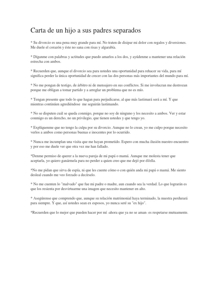 Carta de un hijo a sus padres separados. He perdido el sentido de seguridad por favor no asuman que soy resistente necesito amor atención crianza estabilidad consistencia afecto. No tratéis de aliviar mi dolor con grandes regalos y diversiones. CARTA DE UN HIJO A SUS PADRES SEPARADOS Óscar Augusto Campuzano Garzón. CARTA DE UN HIJO A SUS PADRES SEPARADOS. No traten de disipar mi dolor con grandes regalos y diversiones. Watch popular content from the following creators.